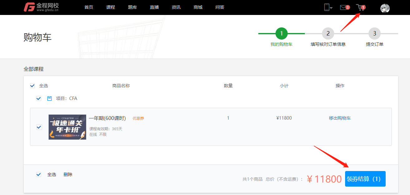 步驟四、 確認(rèn)訂單。請(qǐng)檢查您的購物清單,如您擁有我們金程網(wǎng)校的優(yōu)惠券,也可以選擇使用優(yōu)惠券,并確認(rèn)需要支付的價(jià)格。