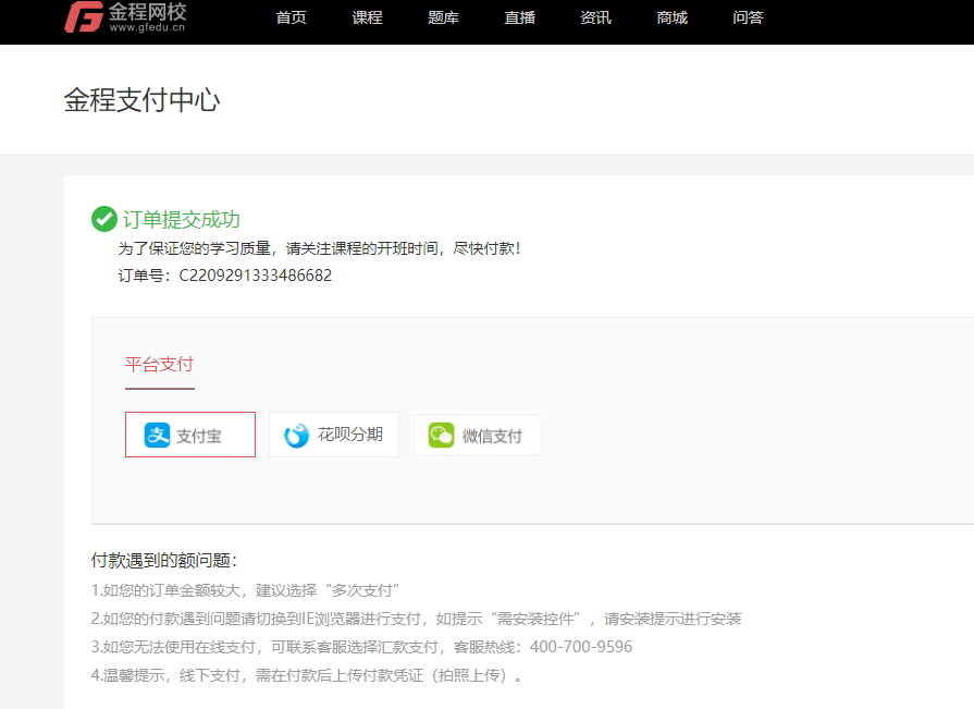 步驟六、在提交訂單后,可以選擇支付寶、微信、花唄分期或線下支付方式進(jìn)行付款。