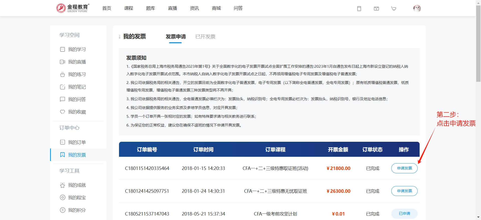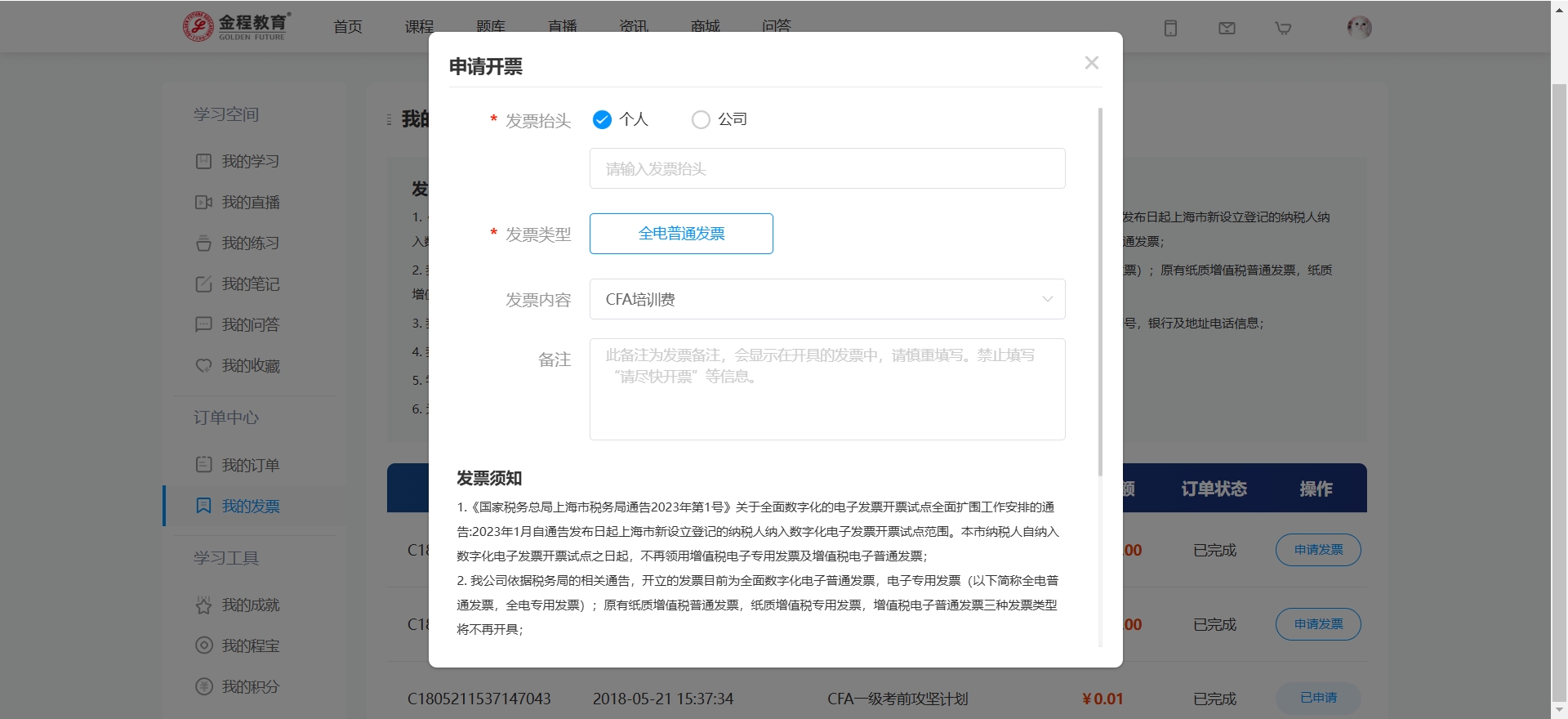 購買完課程,可申請開具發(fā)票,但必須填寫發(fā)票內(nèi)容。