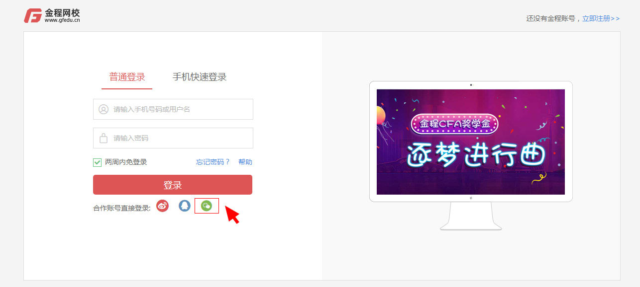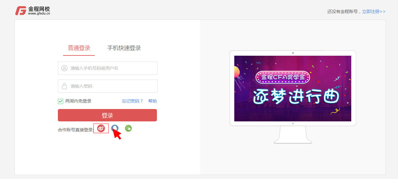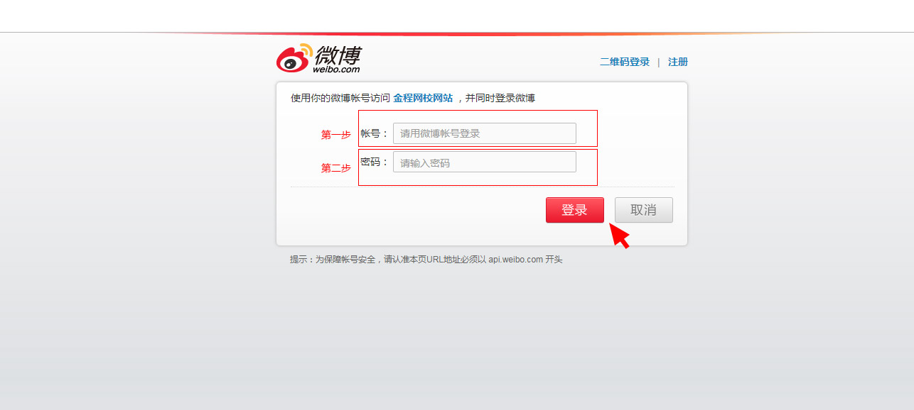 進(jìn)入新浪第三方登錄頁(yè)面,第一步:輸入新浪賬號(hào),第二步輸入新浪賬號(hào)密碼,點(diǎn)擊登錄,即成功登錄金程網(wǎng)校。