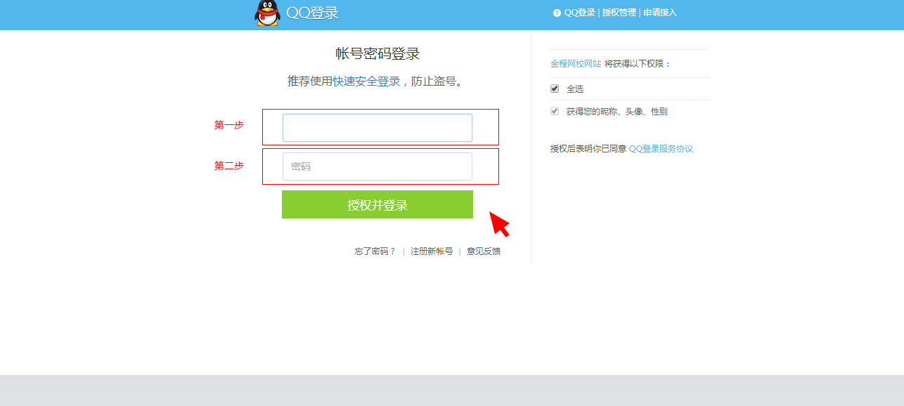 進(jìn)入QQ第三方登錄頁(yè)面,第一步:輸入QQ賬號(hào),第二步輸入QQ賬號(hào)密碼,點(diǎn)擊授權(quán)并登錄,即成功登錄金程網(wǎng)校。