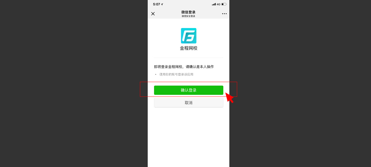 手機(jī)掃描成功后,點(diǎn)擊“確認(rèn)登錄”,即成功登錄金程網(wǎng)校。